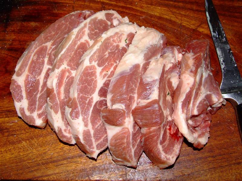 5-pendant ce temps, trier les champignons, les couper en tranches épaisses, les faire dorer dans une poêle avec du beurre saler et poivrer 6-dans une autre poêle, mettre les tranches de viande à dorer avec une noix de beurre pendant 3 minutes environs, saler, retourner, saler l'autre côté et poursuivre la cuisson pendant encore 2 minutes 7-déposer dans chaque assiette, un morceau d'échine, accompagner de pommes de terre et de champignons, napper la viande de sauce et parsemer de persil ciselé