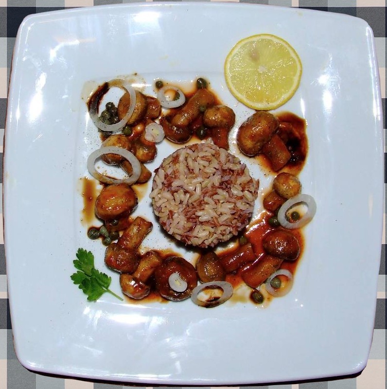 5-retirer le thym, le romarin et le clou de girofle, saupoudrer de persil haché, et laisser refroidir 6-mettre une casserole d'eau salée à bouillir 7-quand l'eau bout, verser le riz en pluie, remuer, faire cuire à petit bouillons le temps indiqué sur le paquet par le fabricant 8-égoutter le riz, le répartir dans chaque assiette, entourer de champignons, ajouter l'oignon coupé en fines rondelles, parsemer de câpres, et napper de sauce servir frais vin conseillé: Bordeaux blanc sec |