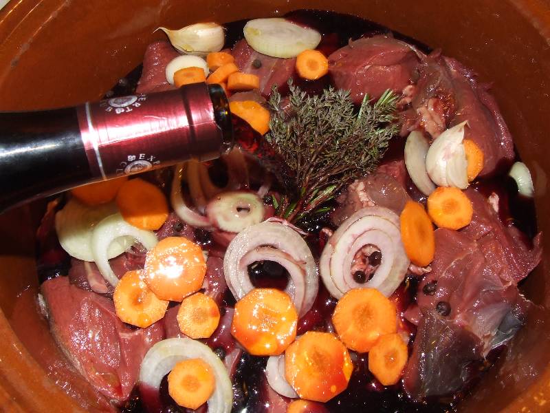 1-pour 10 personnes, deux jour avant, découper la gigue de chevreuil en cubes, mettre à mariner dans un grand plat creux avec deux carottes et les oignons coupé en rondelles, le bouquet garni, deux gousses d'ail écrasées avec la paume de la main, les grains de genièvre, arroser d'un filet d'huile d'olive, mouiller avec le vin rouge et mettre au frais pour 24 heures 2-préparer un fond de gibier avec les