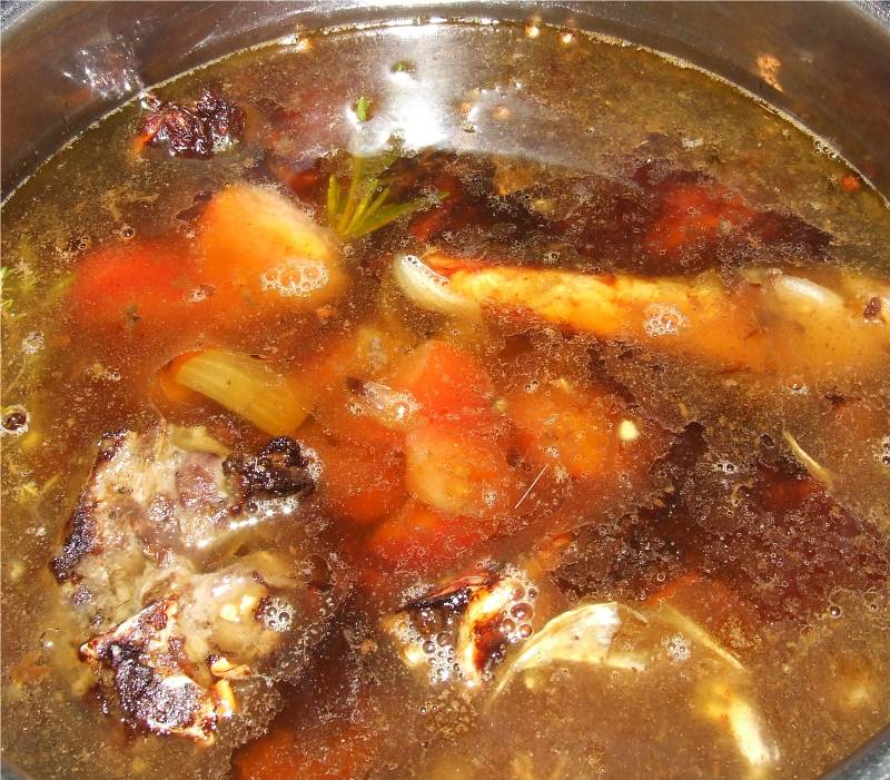 et faire suer au four 10 minutes 3-retirer à l'aide d'une écumoire le contenu de la plaque à rôtir et mettre dans une casserole, mouiller avec 2 litres d'eau froide et le vin blanc, ajouter le thym, le romarin, une gousse d'ail piquée d'un clou de girofle, une feuille de laurier, les grains de poivre et de coriandre, les tomates coupées grossièrement, porter à ébullition, puis baisser le feu et faire cuire 4 heures à ébullition lente et régulière en écumant fréquemment, en fin de cuisson passer au chinois dans un récipient sans fouler, puis refroidir très rapidement en plongeant le récipient dans un saladier rempli de glaçons, puis mettre au frais jusqu'au lendemain 4-le lendemain, sortir le plat contenant la gigue de chevreuil, prélever la viande et les légumes de la marinade bien les égouter, mettre dans une marmite avec un peu d'huile d'olive et faire suer une quinzaine de minutes |