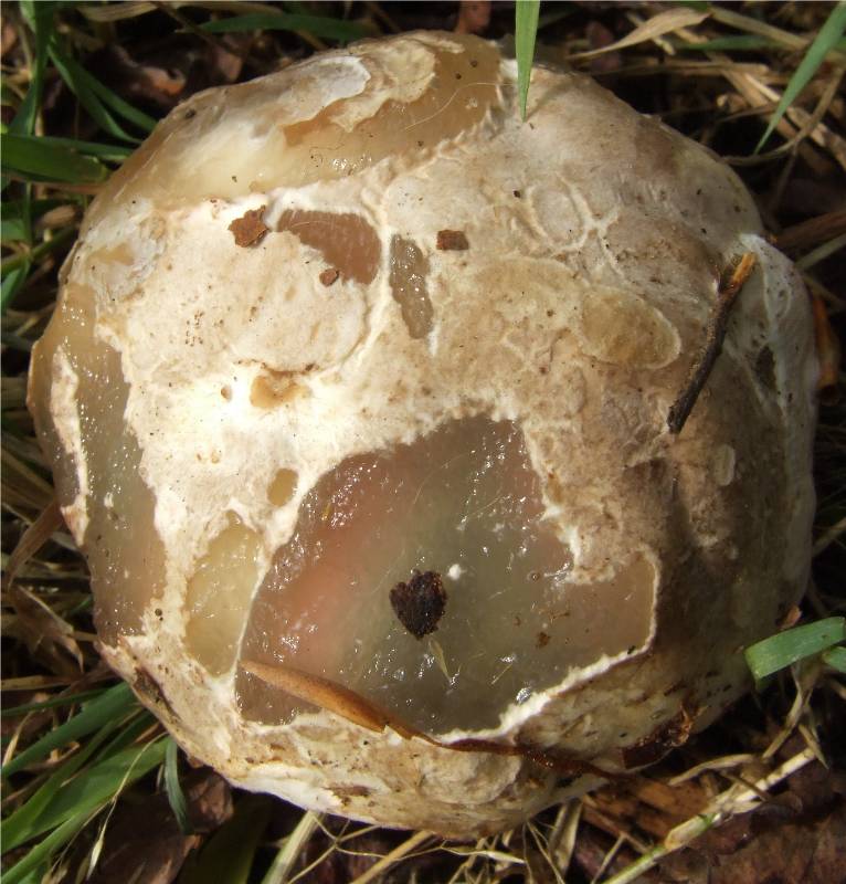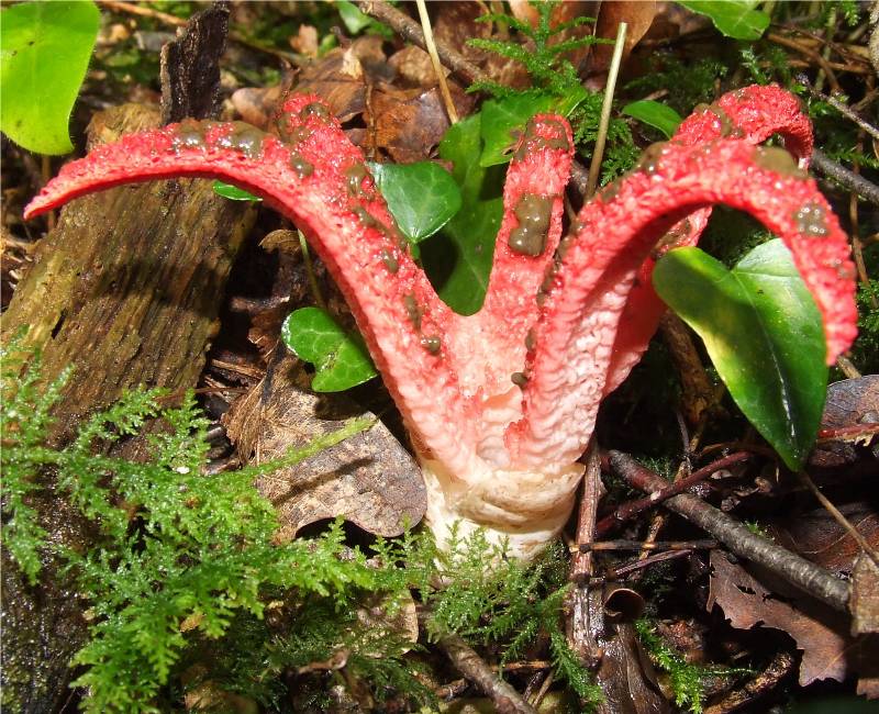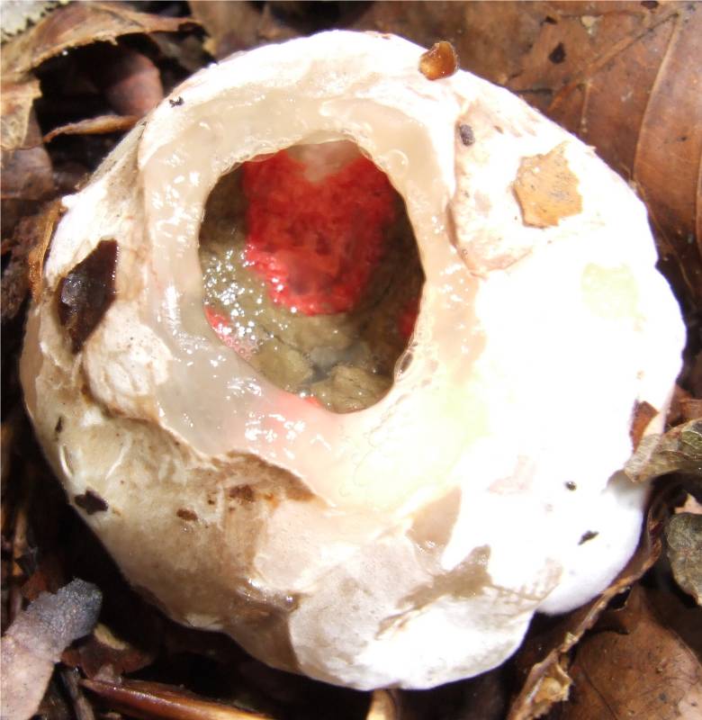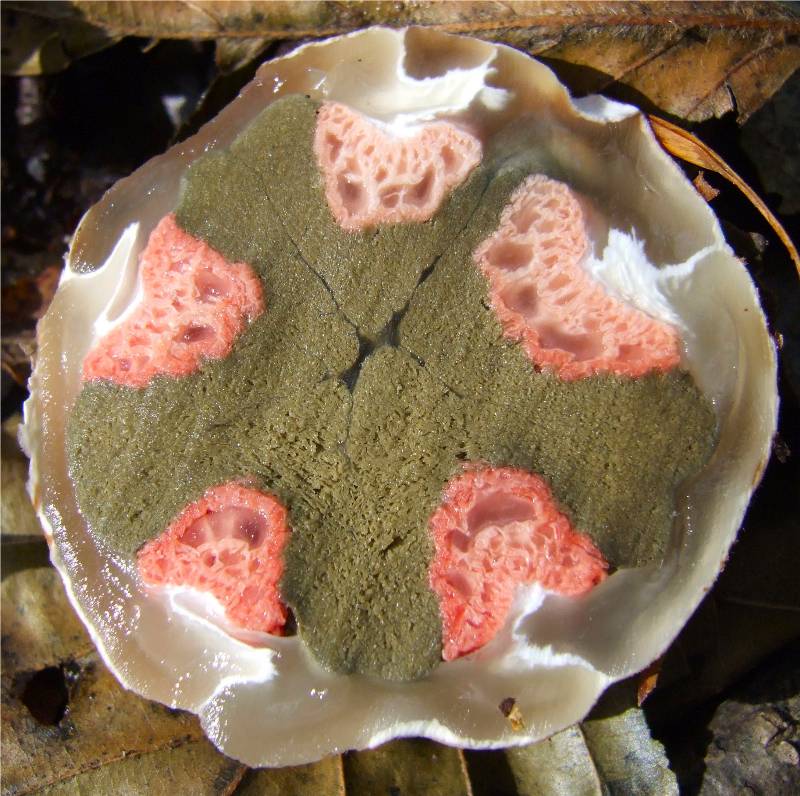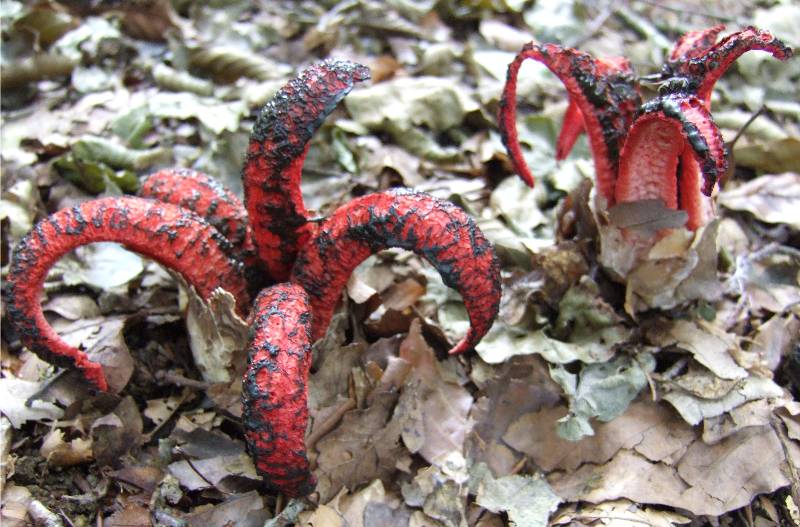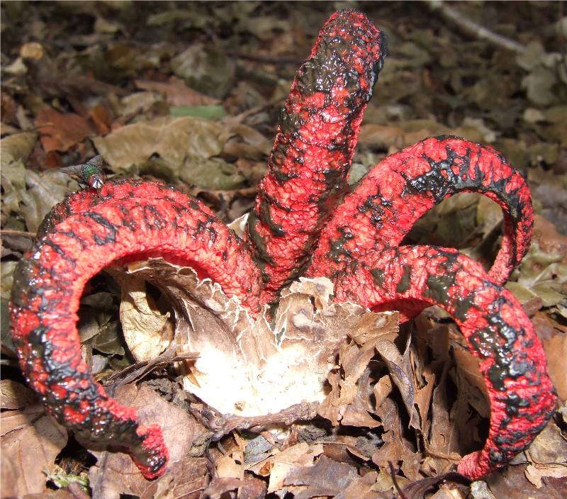 champignon prenant naissance dans un "oeuf" blanc émergant partiellement du sol, à maturité la couche externe se déchire et libère 3 à 8 bras, reliés d'abord les uns aux autres par leur sommet, se séparant ensuite, le champignon prend alors l'aspect d'une étoile de mer. |