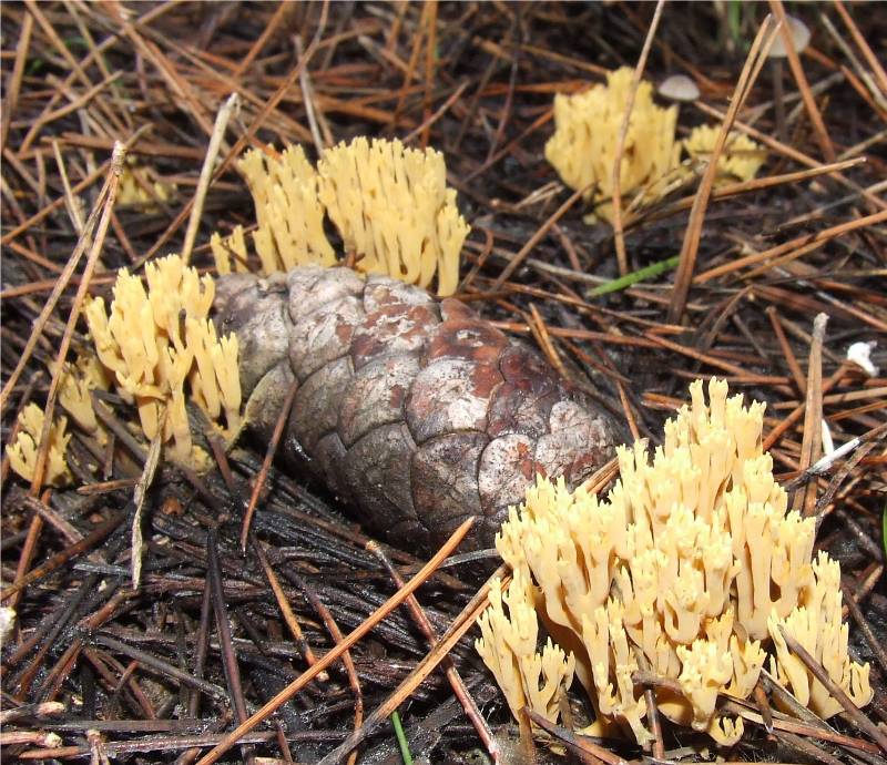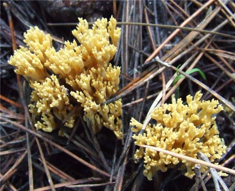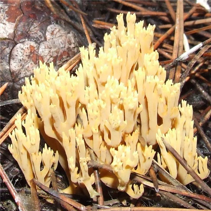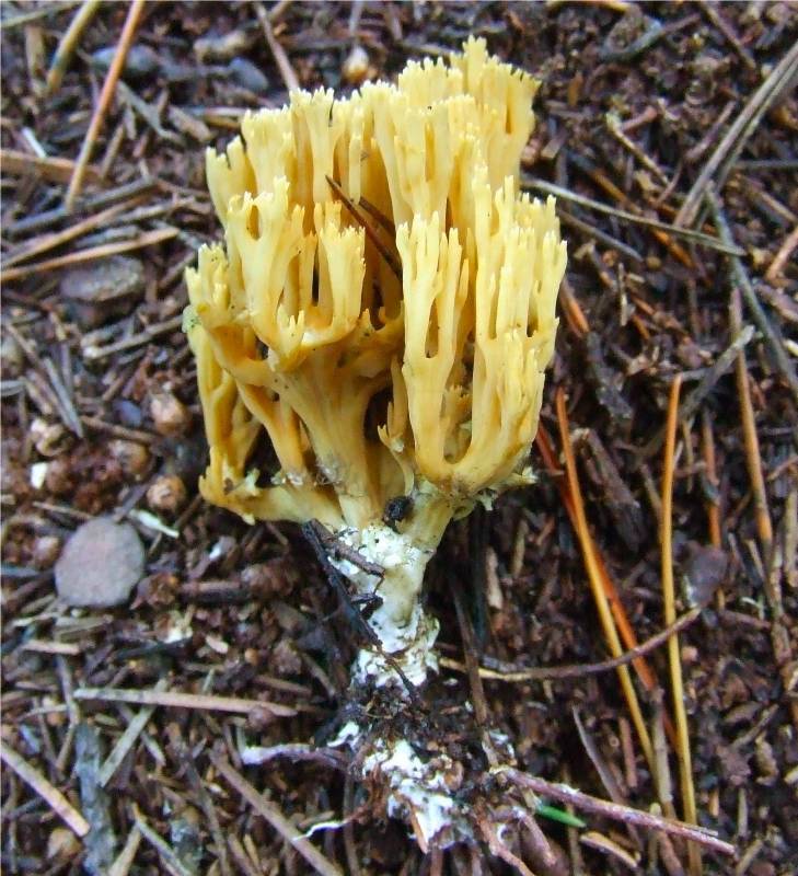 en forme de corail, de 2 à 6 cm de haut et jusqu'à 5 cm de large, de couleur ocre à jaune-brun, constituée de rameaux de 1 à 3 mm de diamètre, ocre jaune à ocre brun, terminés par 2 ou 3 petites pointes plus claires |