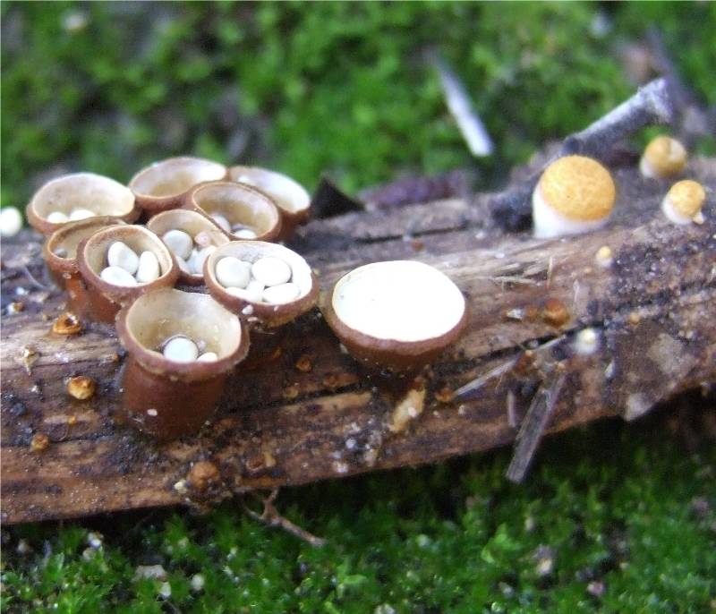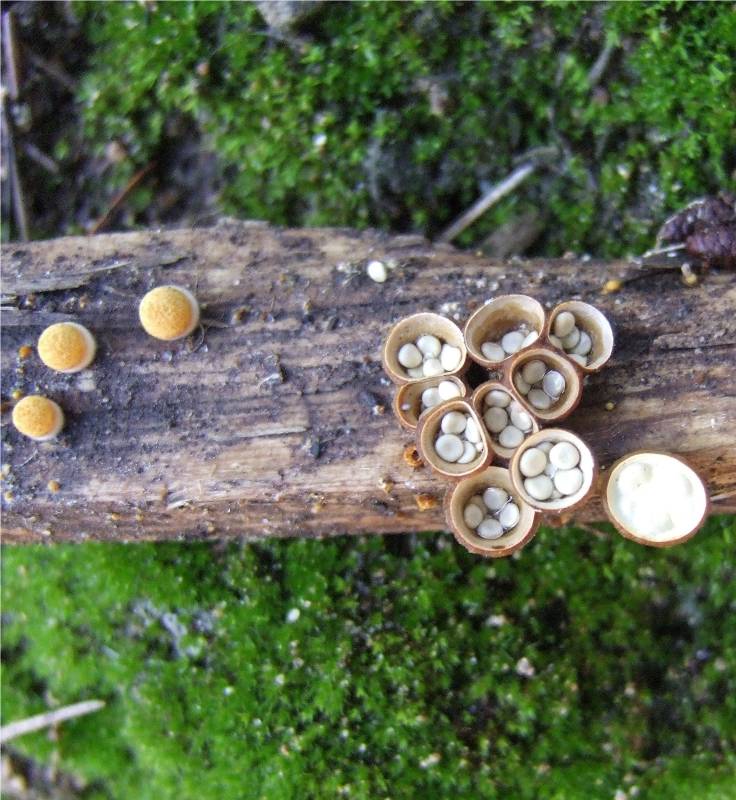 0,5 à 0,8 cm de diamètre, 0,5 à 1 cm de haut, en forme de cône renversé à base tronquée, ressemblant à un petit "nid", recouvert d'une membrane protectrice de couleur ocre se flétrissant à maturité laissant apercevoir à l'intérieur de petits "oeufs" nommés péridioles et renfermant les spores, ces péridioles ressemblent à des lentilles de 1 à 2 mm de diamètre, de couleur blanche devenant brunâtre avec l'âge |