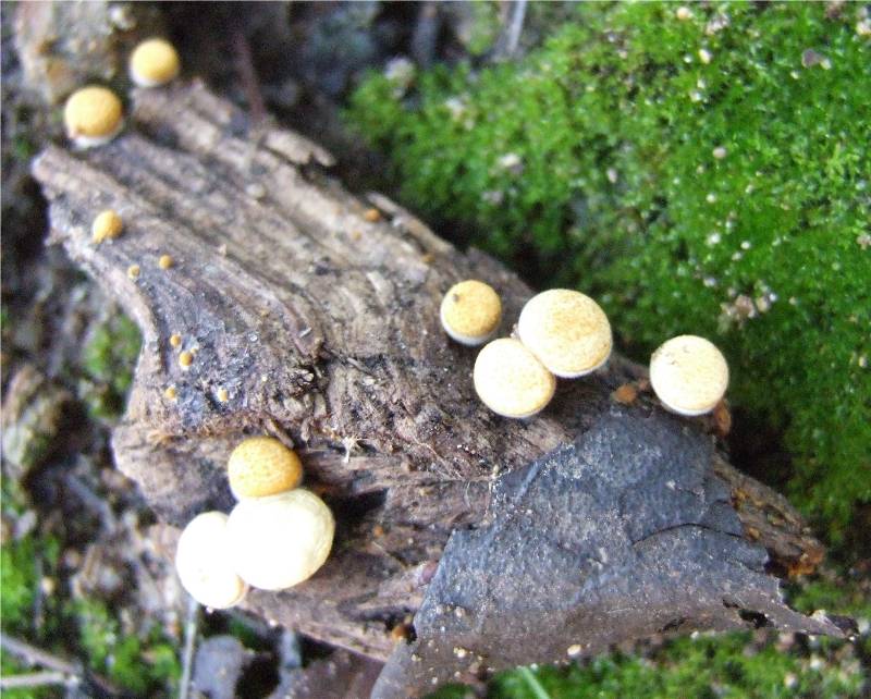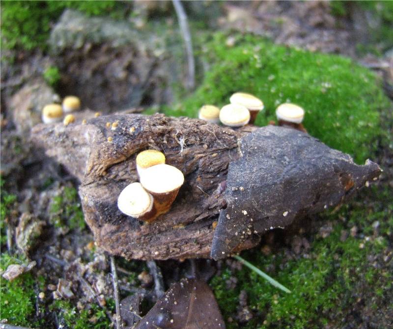 sur bois pourrissant humide,.toute l'année hors période de gel, en groupes, assez courant mais difficilement remarquable de par sa petite taille, toutefois la membrane ocre permet de le distinguer selon la couleur de son support |