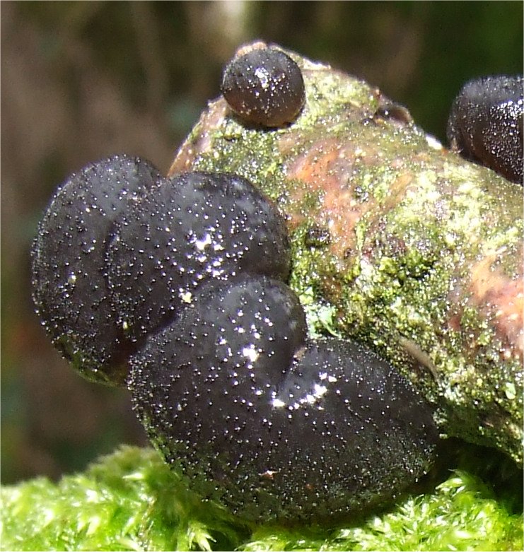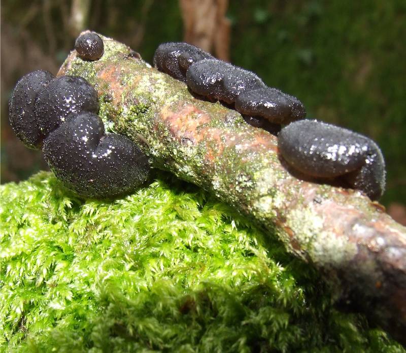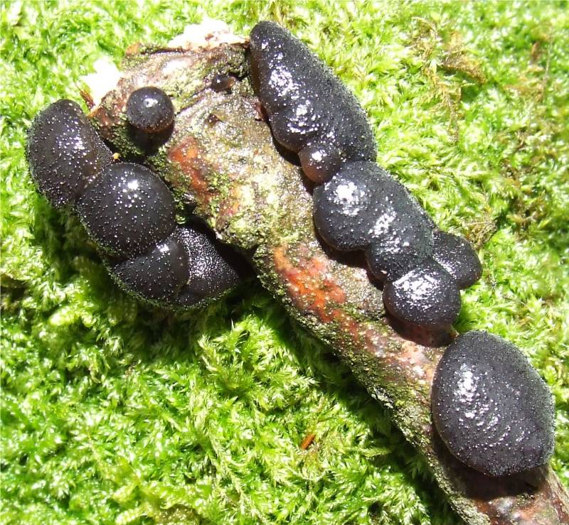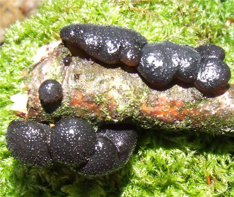 masse gélatineuse d'abord en forme de coussinets noirs de 3 à 10 cm de long , ayant l'aspect du goudron, de forme très variable, la partie fertile est recouverte de petits pustules que l'on peu sentir en l'effleurant, les spécimens âgés prennent une forme lobé ou cérébriforme et se dessèche pour ne devenir qu'une fine pellicule noire sur leur support |