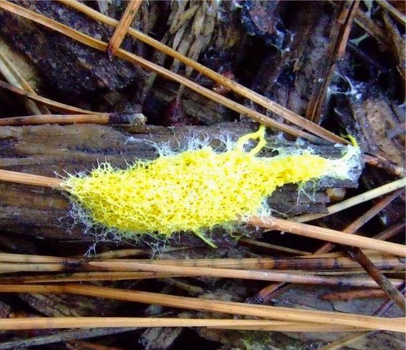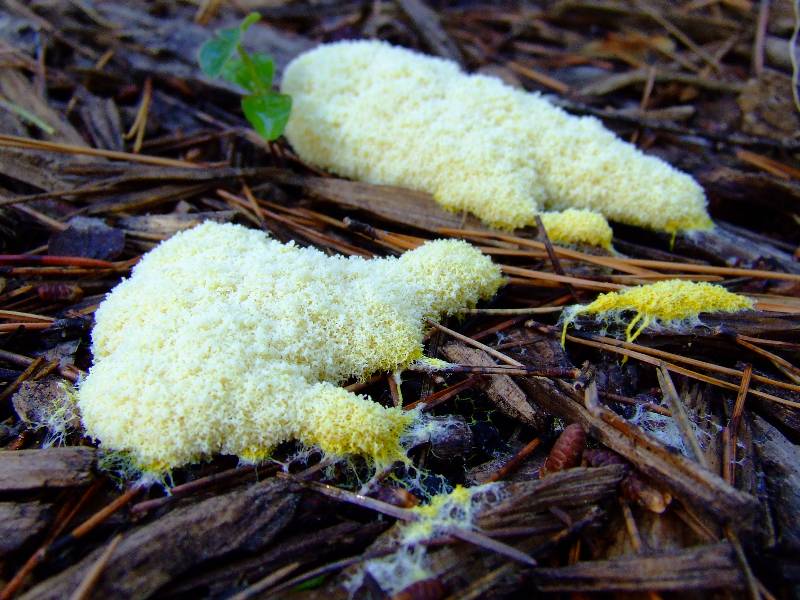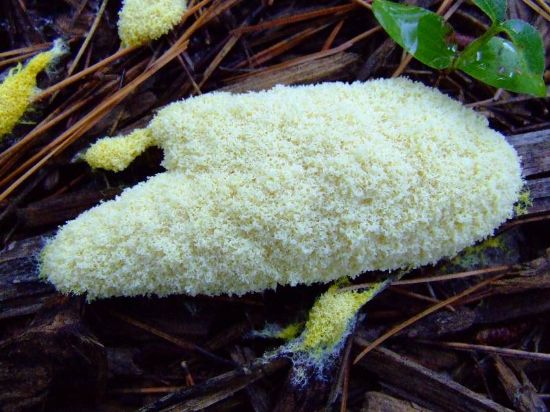 masse informe, parfois plus ou moins hémisphérique mais en général aplatie et irrégulière, de 2 à 6 cm, voire 10 cm de largeur et 20 cm de longueur, 1 à 3 cm d'épaisseur, de couleur jaune vif, rappelant la texture " d'oeuf mimosa ", très molle, puis plus dure et plus terne.
