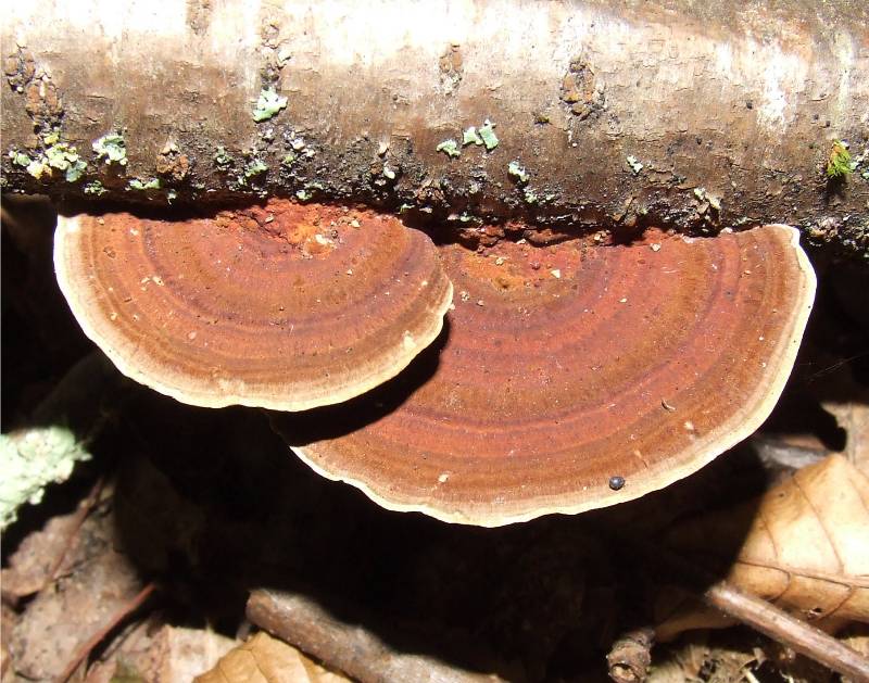 sur bois mort de feuillus ( hêtres, bouleaux... ) et de résineux, en nombreux chapeaux en console étagées tout au long des branches.Très fréquent toute l'année. |