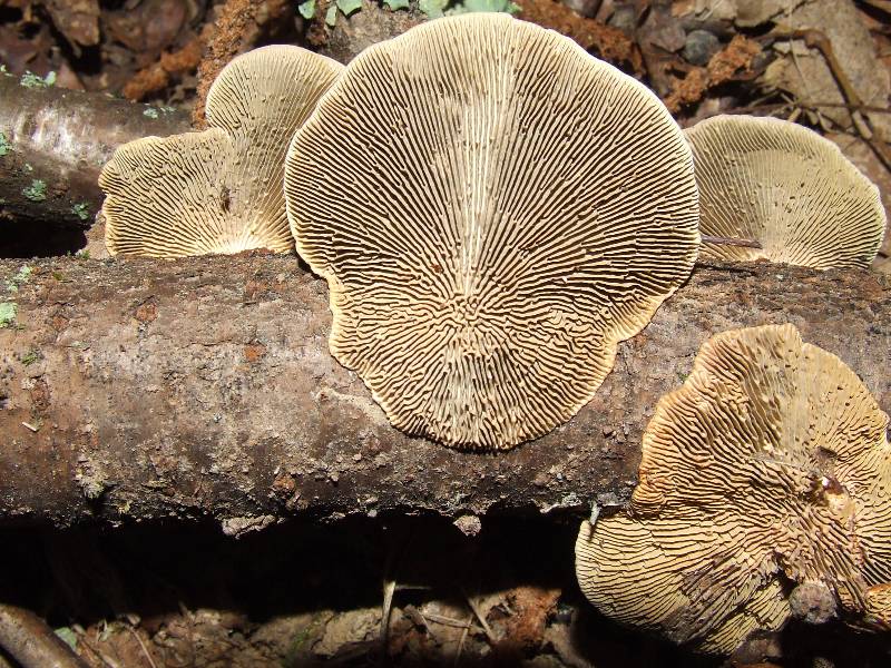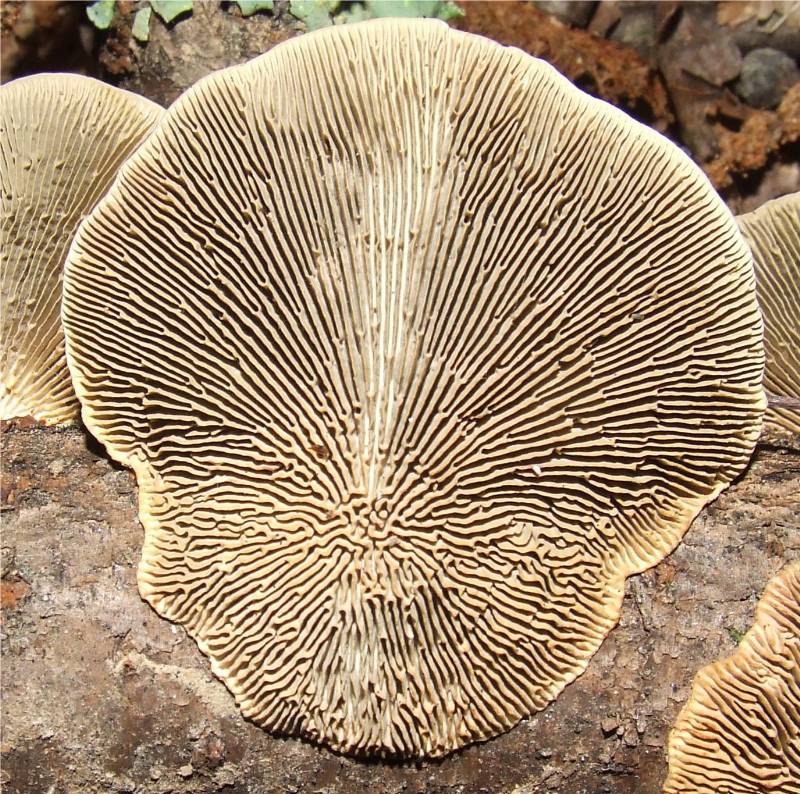 en lames minces serrées irrégulières, anastomosées près de l'insertion, blanc crème brunissant avec l'âge. |