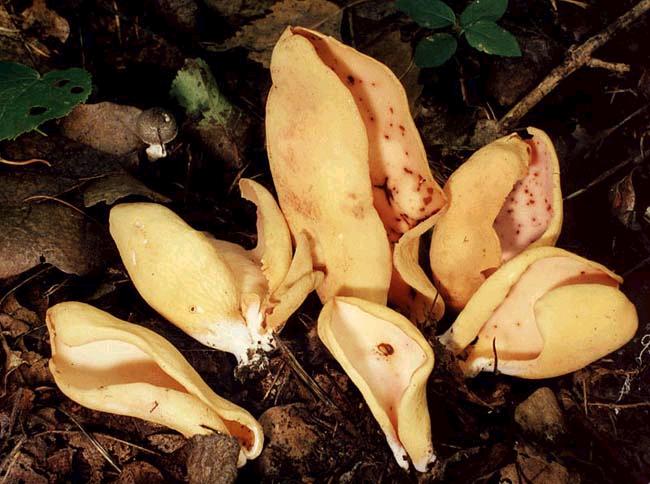 jusqu' à 10 cm de haut, champignon spectaculaire en forme d' oreille fendue à la base, de couleur citron à jaune orangé, faces interne et externe lisses, des taches de rouille peuvent apparaître avec l' âge.