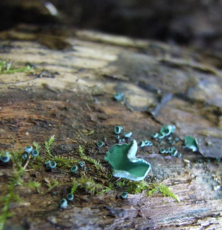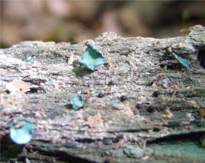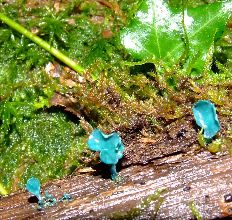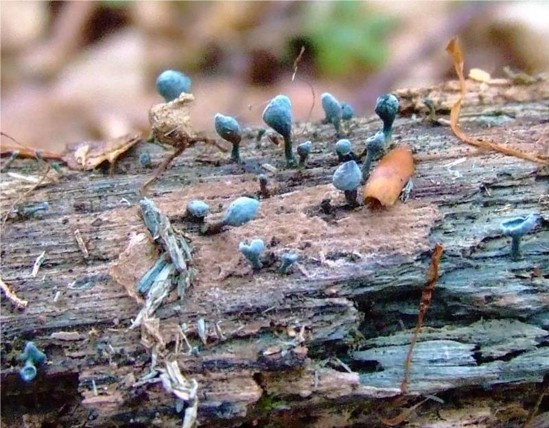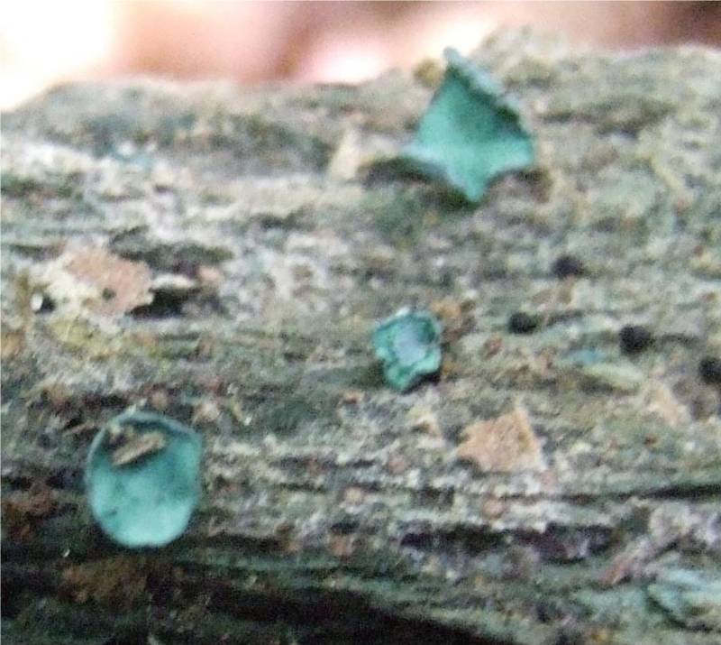 aucune confusion possible, certaines années cette espèce ne fructifie pas si les conditions atmosphériques ne sont pas réunies, toutefois sa présence est facilement repérable car son mycélium bleu-vert comme le champignon lui même, colore le bois qui lui sert de support. Le bois coloré par cette pézize, lorsqu'il n'est pas trop décomposé, est recherché par les ébénistes pour l'utiliser en marqueterie.En effet le pigment bleu-vert nommé "Xylindéine" résiste très bien à la lumière. |