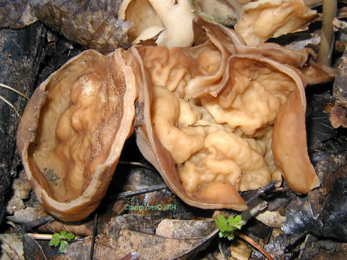forme étalée ou en coupe de 5 à 15 cm, lobé.Face supérieure plissée, boursouflée, brun-fauve.Face inférieure crème crème, très finement granuleuse |