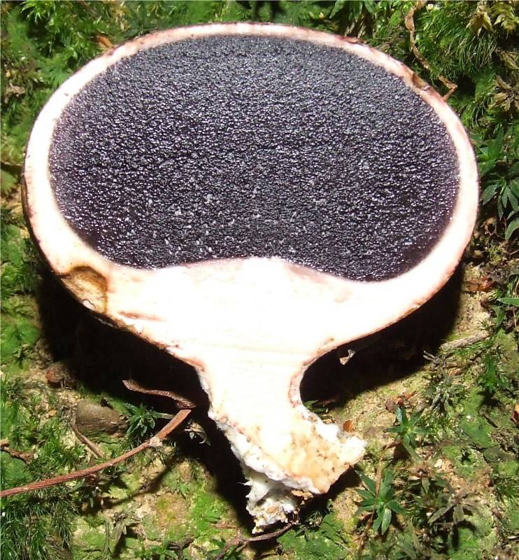 blanchâtre, devenant brun violacé par la suite, puis noirâtre violacé et pulvérulente, la surface du sommet se craquelle puis se déchire en forme d'étoile pour expulser les spores. |
