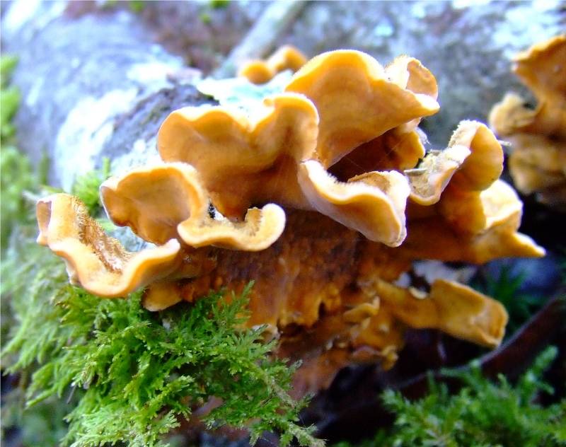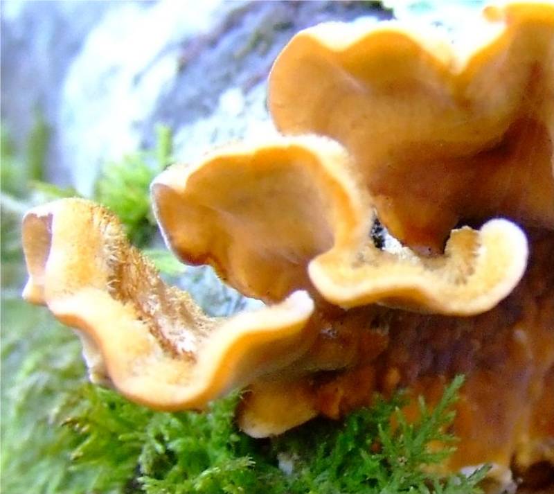d'abord en croûte circulaire, puis se décollant en partie et ondulant, de 2 à 10 cm de long et 1 à 3 cm de large, de couleur jaune soufre, avec des zones concentriques orangées, puis grisâtre, feutrée de poil blanc, marge lobée et ondulée de couleur jaune vif chez les jeunes sujets. |