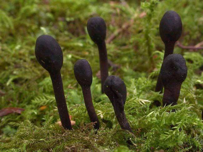 en forme de massue, de 3 à 12 cm de haut; de couleur noire, le sommet renflé est en général un peu comprimé comme une batte de cricket et varie souvent fortement de taille et de forme.La surface de cette massue est parsemée de poils. |