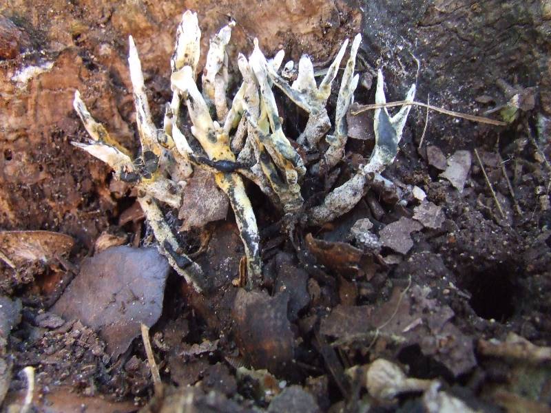 de 2 à 8 cm d' abord en forme de petits pilons, puis en arbuscules plus ou moins ramifiés tels des bois de cervidés, noir à la base et sommet blanc poudreux, devenant entièrement noir avec l'âge, coriace et profondément implantés dans leur support.
