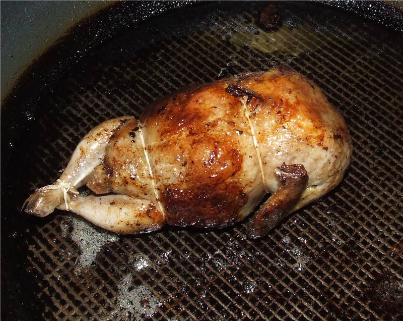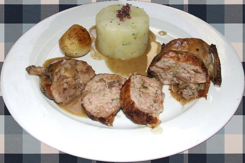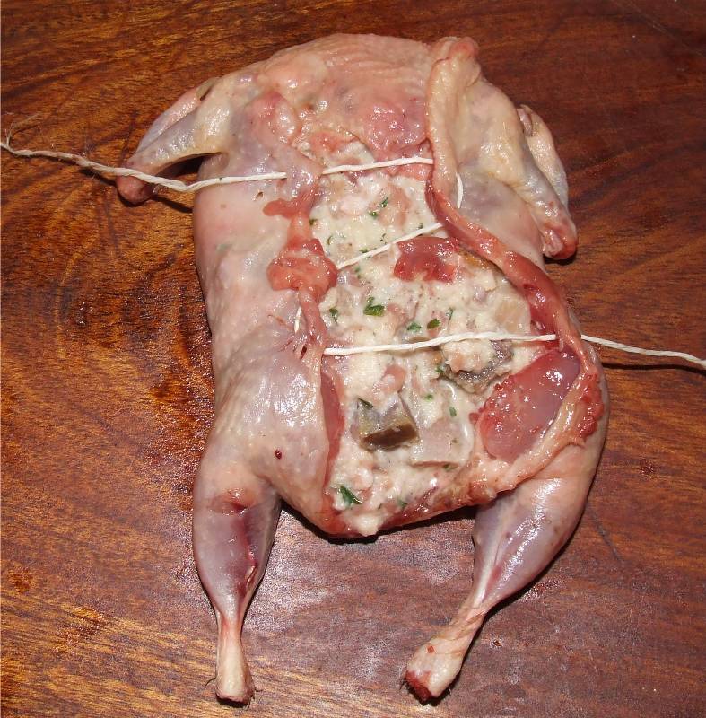 5-dans un petit saladier, mettre la chair à saucisse, les cèpes le persil et la gousse d'ail restante hachés, ajouter la mie de pain essorée pour éliminer le surplus de lait, un oeuf, un tour de moulin à poivre, bien mélanger le tout 6-sur un plan de travail, déposer les cailles côté peau en dessous, disposer sur chacune d'elle une couche de farce sans excès, replier la peau du cou vers l'intérieur, refermer et coudre les cailles pour leur redonner la forme initiale et les brider 7-dans une sauteuse huilée faire colorer les cailles de tout côtés sur feu modéré, les saler 8-passer le contenu de la casserole au chinois, le verser dans la sauteuse contenant les cailles, bien gratter le fond pour décoller les sucs de cuissons, couvrir et laisser cuire à couvert sur feu doux pendant en arrosant fréquemment au cours de la cuisson 9-pendant ce temps, réaliser une purée avec les pommes de terre 10-en fin de cuisson rectifier l'assaisonnement si nécessaire, servir les cailles accompagnée de purée napper le tout de sauce et servir aussitôt |