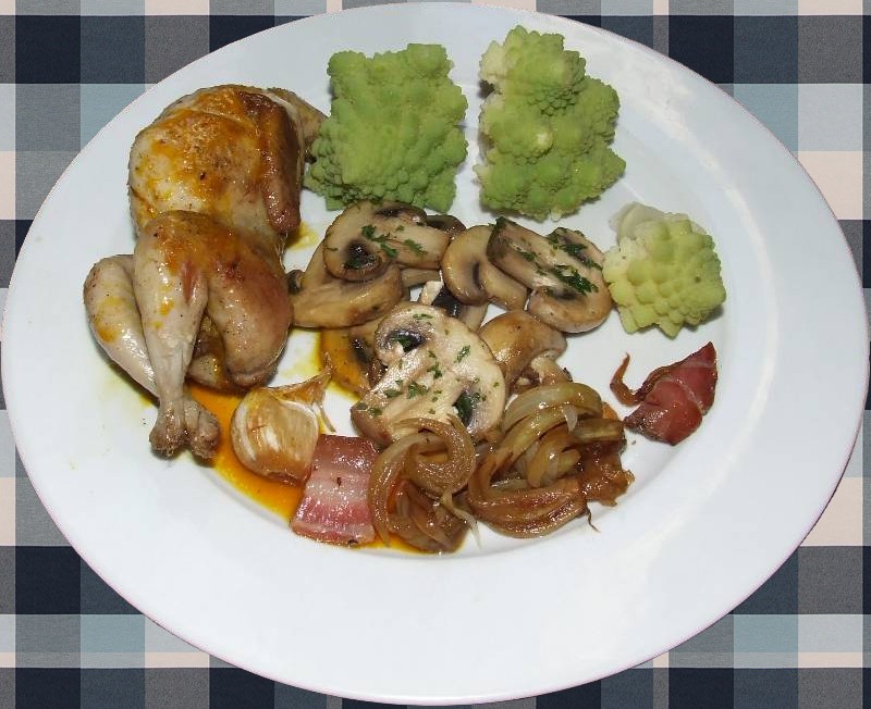 6-en fin de cuisson des cailles, les retirer et les réserver au chaud ainsi que la garniture (oignon, gousses d'ail, dés de ventrêche) mais laisser le jus de cuisson dans la casserole 7-ajouter dans la casserole la cuillère de colorant alimentaire, bien mélanger et déglacer avec le jus de clémentine et faire réduire de moitié 8-retirer le chou de la casserole, bien l'égoutter et réserver 9-dans une poêle avec un peu d'huile, mettre les champignons, quand ils sont bien dorés, ajouter les deux gousses d'ail restantes hachées avec le persil, saler poivrer et bien mélanger 10-disposer dans chaque assiette une caille avec quelques bouquets de chou, accompagner avec les champignons et la garniture, napper les cailles de sauce et servir aussitôt vin conseillé: Côte du Rhône rouge |