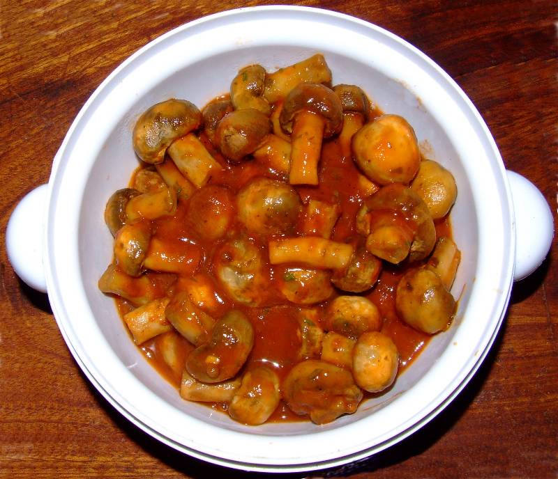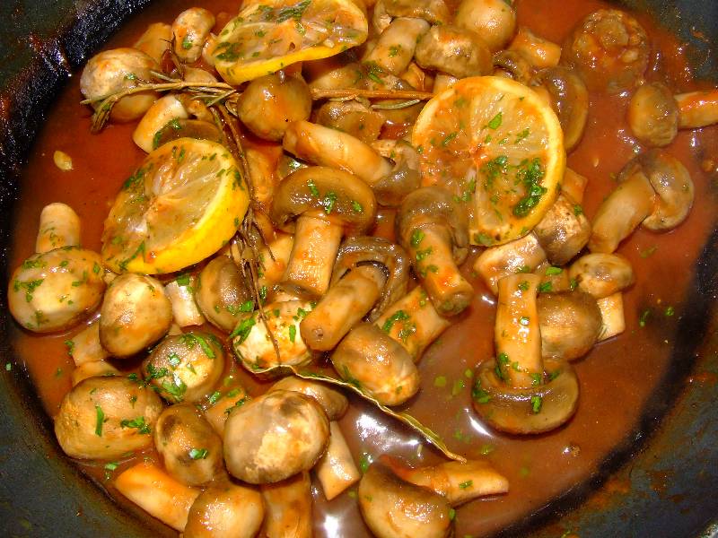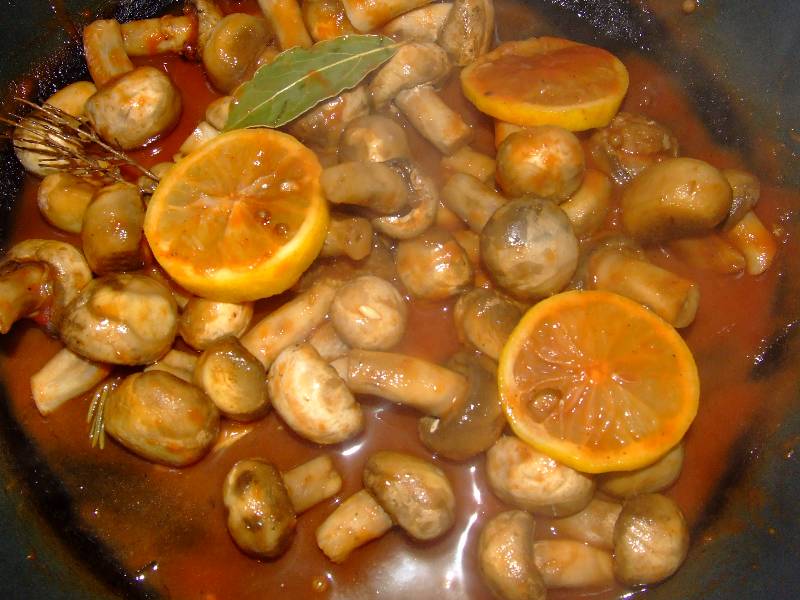 1-nettoyer les champignons, couper le bout terreux du pied 2-faire réduire le vin dans une casserole avec le sel, le poivre, le sucre, la coriandre et le clou de girofle 3-verser l'huile dans une poêle, faire chauffer sur feu moyen, et faire étuver les champignons avec le citron en rondelles 4-au bout de 5 minutes de cuisson, verser la réduction de vin sur les champignons, avec le concentré de tomate, le thym, le romarin, le laurier, bien mélanger et laisser mijoter le tout 10 minutes environ à couvert |