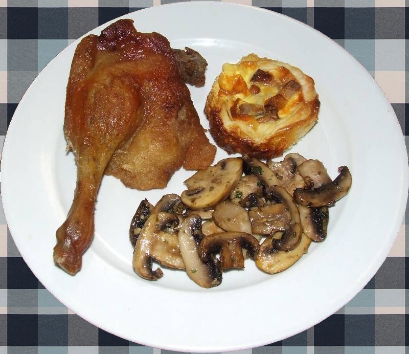 6-sortir les girolles à l'aide d'une écumoire et les laisser égoutter dans une passoire 7-dans la même casserole, plonger la poitrine fumée coupée en lardons, faire blanchir pendant 3 minutes également et égoutter 8-garnir le fond des tartelettes de lardons et de girolles 9-dans un grand bol, verser la crème fraîche, l'oeuf, une pincée de muscade fraîchement râpée, saler, poivrer, bien battre le tout à l'aide d'une fourchette, verser sur les tartelettes et enfourner à 240° pendant 20 minutes, puis les réserver 10-un quart d'heure avant la fin de cuisson des cuisses de canard, nettoyer et trier les champignons de paris, les couper en lamelles épaisses et les faire sauter dans une poêle avec un peu de graisse de canard, parsemer de persil et l'ail restant haché 11-disposer dans chaque assiette une cuisse de canard bien égouttée, quelques champignons persillés, une tartelette aux girolles et servir aussitôt |