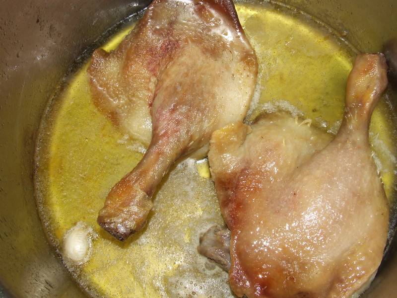 1-la veille, mettre dans un plat une couche de gros sel, déposer dessus les cuisses de canard coté peau vers le bas, intercaler un brin de thym, recouvrir les cuisses d'une fine couche de sel, couvrir et garder au frais pendant 24 heures 2-le jour même, sortie les cuisses de canard de leur plat, les rincer soigneusement sous l'eau fraîche pour bien éliminer le surplus de sel, puis bien les éponger avec du papier absorbant 3-mettre les cuisses dans une casserole avec la graisse de canard fondue, 4 gousses d'ail et faire cuire à petits frémissements pendant 2 heures 4-pendant ce temps, foncer des petits moules à tartelettes avec la pâte feuilletée, piquer le fond de quelques coups de fourchette pour éviter que la pâte ne gonfle, recouvrir de papier sulfurisé et enfourner à blanc pendant 10 minutes à 240° 5-nettoyer les girolles, les plonger dans une casserole d'eau bouillante et les blanchir pendant 3 minutes vin conseillé: Madiran rouge |