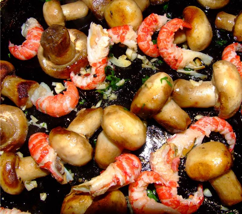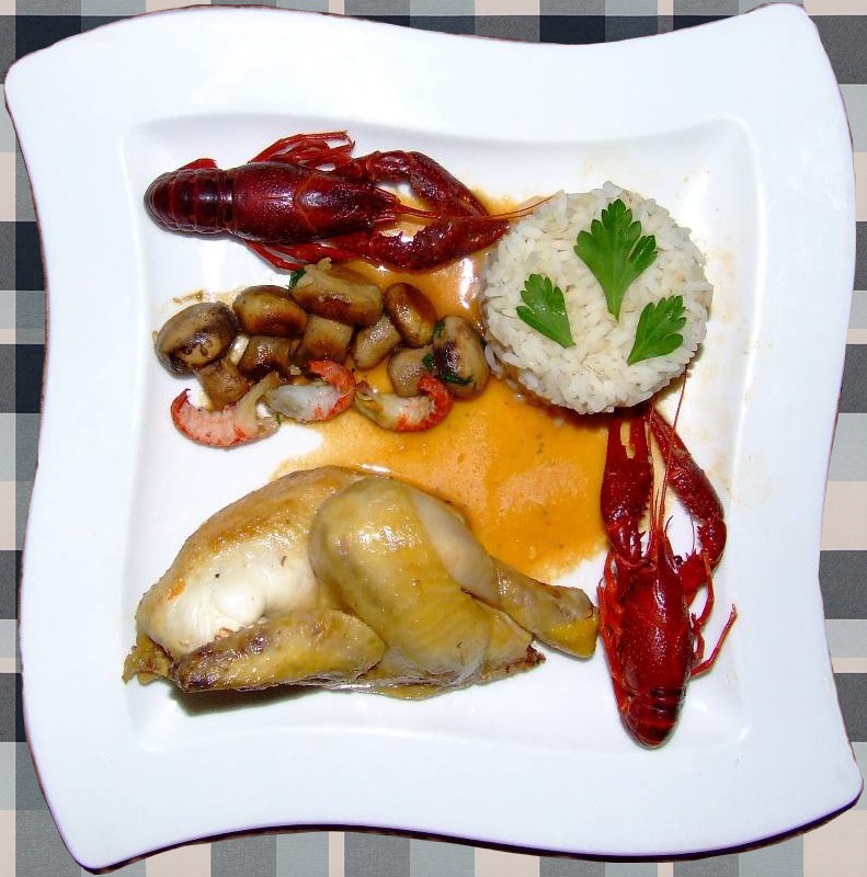6-au bout de trente minutes, retirer la casserole contenant les têtes et pinces, verser le contenu dans un moulin à légumes, passer le tout, mettre sur le feu le fumet obtenu, ajouter la maïzena et laisser réduire jusqu'à obtention d'une sauce onctueuse 7-dans une poêle avec un peu de beurre, mettre les champignons à dorer, ajouter les queues des écrevisses, l'ail et le persil haché, saler, poivrer, bien remuer et réserver, une fois cuit égouter le riz 8-couper les coquelets en deux dans le sens de la longueur 9-disposer dans chaque assiette la moitié d'un coquelet, mettre à coté le riz, les champignons et les queues d'écrevisses, deux écrevisses entières préalablement réchauffées et naper de sauce