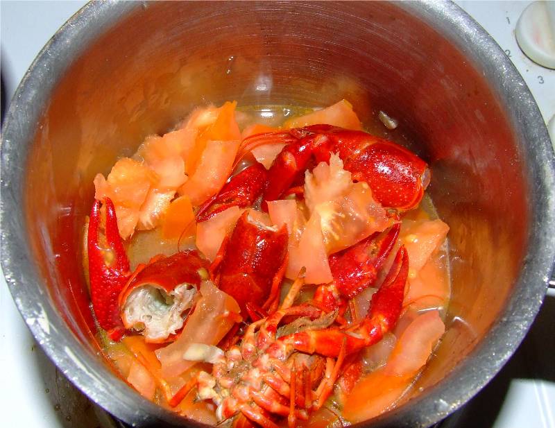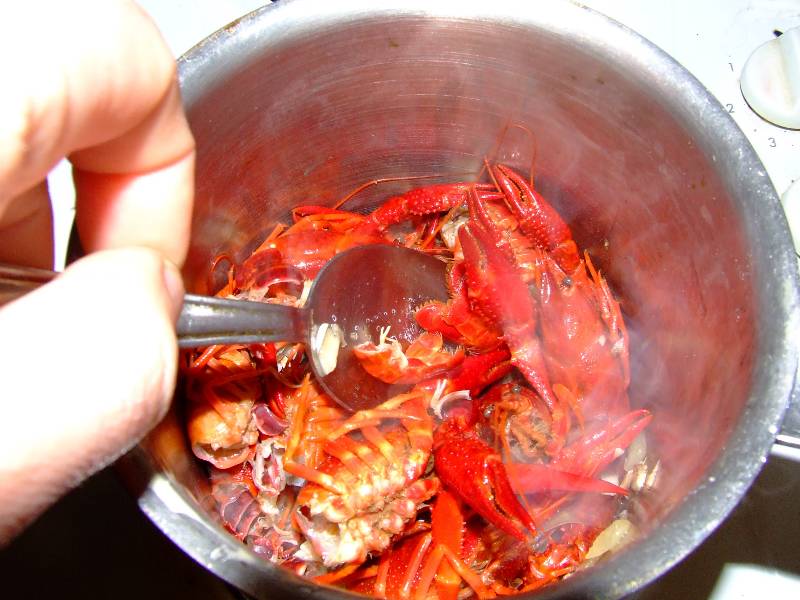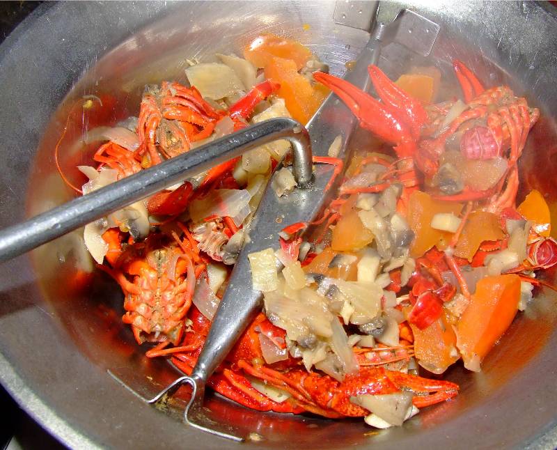 1-mettre les coquelets dans une cocotte en fonte avec un peu d'huile, les saler et faire rôtir pendant en les retournant sur toute les faces 2-décortiquer les écrevisses décongelées sauf huit qu'il faut conserver entières, réserver les queues, et mettre de coté les têtes et les pinces 3-émincer grossièrement au couteau l'oignon et quatre champignons bien nettoyés 4-dans une petite casserole avec une noix de beurre, mettre l'oignon et les champignons à dorer, ajouter les têtes et les pinces d'écrevisses, les tomates concassées, verser l'armagnac, faire flamber, ajouter le vin blanc, saler, poivrer et faire cuire à petits bouillons une trentaine de minutes 5-pendant ce temps mettre dans une casserole d'eau bouillante salée le riz et cuire pendant vingt minutes, nettoyer les champignons restant |