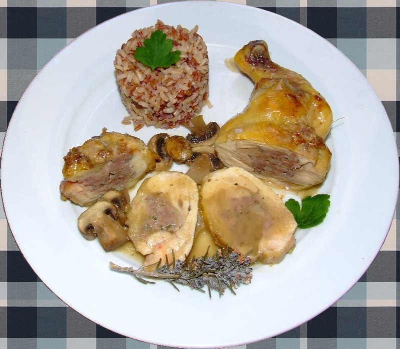 5-dans une poêle anti adhésive avec un peu d'huile mettre les cuisses de poulet légèrement salées et les faire cuire une heure à petit feu en les retournant de temps en temps 6-une demi heure avant la fin de cuisson des cuisses, mettre de l'eau salée à bouillir, quand l'eau bout, verser en pluie le riz, remuer et respecter les indications de cuisson sur l'emballage 7-pendant ce temps, nettoyer et couper les champignons en lamelles, passer le contenu de la casserole contenant les os concassés au chinois, ajouter les lamelles de champignons et faire réduire jusqu'à obtention d'une sauce, ci celle ci est trop liquide lier avec de la farine ou de la maïzena, rectifier l'assaisonnement en sel et en poivre si nécessaire 8-égoutter le riz, sortir les cuisses de poulet de la poêle, les débarrasser au maximum de gras de cuisson à l'aide de papier absorbant, enlever la ficelle autour des cuisses 9-déposer dans chaque assiette une cuisse de poulet farcie, accompagner de riz et napper de sauce aux champignons, et servir sans attendre