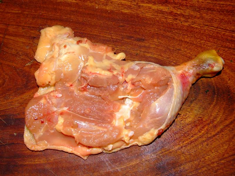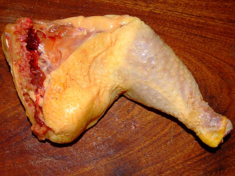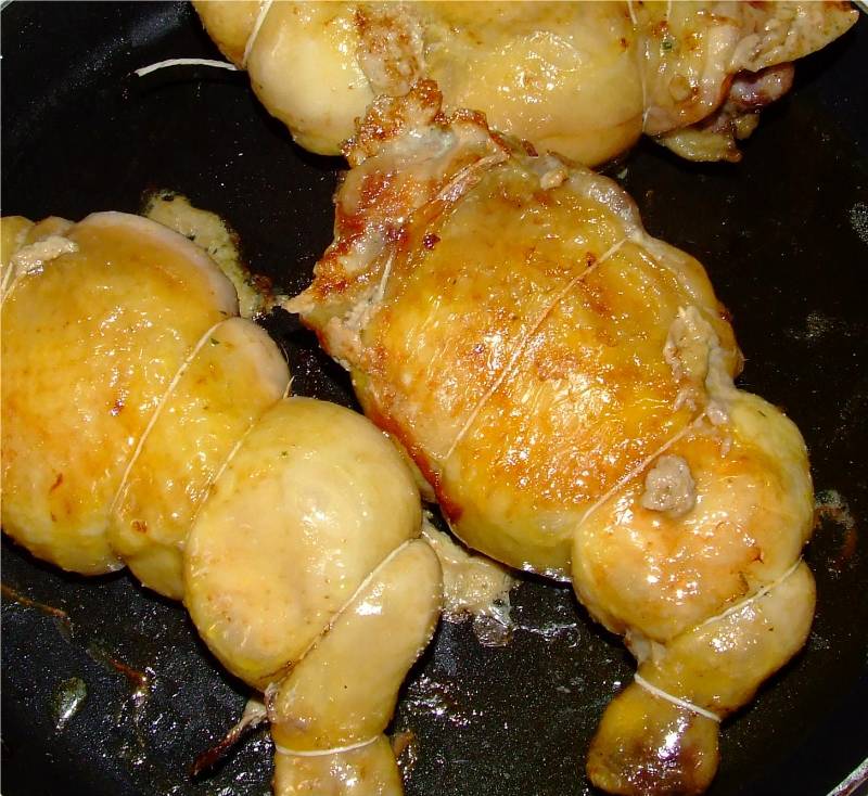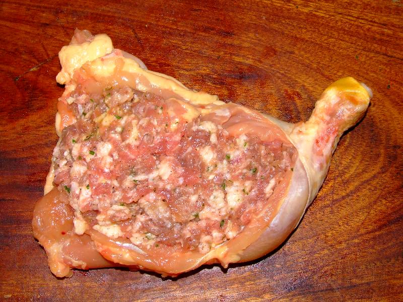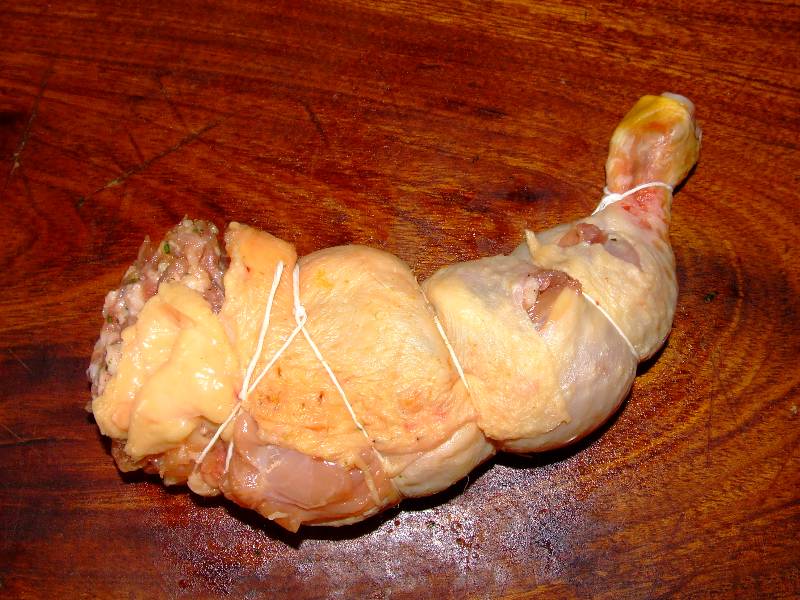 1-dans un petit saladier, mettre la chair à saucisse, ajouter l'échalote finement hachée, deux gousses d'ail et une cuillère à soupe de persil haché, un oeuf, la sauge, bien mélanger le tout, poivrer et réserver au frais ( ne pas saler la chair à saucisse est déjà salée) 2-poser sur une planche à découper une cuisse de poulet coté peau en dessous, à l'aide d'un couteau fin et très aiguisé inciser la chair du haut de cuisse le long du fémur, déboîter la rotule, dégager la chair autour du fémur et retirer l'os, pratiquer de même avec le pilon, inciser le long de l'os, dégager la chair autour et couper l'os avec un couperet tout en gardant un petit bout pour la présentation, recommencer l'opération avec les autres cuisses et réserver au frais 3-mettre dans une casserole avec un peu d'huile, les os des cuisses concassés, l'oignon émincé, faire roussir, mouiller avec 60 cl d'eau, décoller les sucs de cuisson en grattant le fond de la casserole, ajouter les deux gousses d'ail restante, un brin de thym et de romarin et laisser cuire à couvert à feu doux pendant deux heures 4-étaler une cuisse de poulet bien à plat, la recouvrir de farce, rouler la cuisse pour lui redonner sa forme initiale et la ficeler avec de la ficelle alimentaire recommencer l'opération avec les autres cuisses |