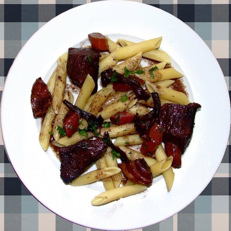 5-quand l'oignon est doré remettre les morceaux de viandes, saupoudrer de farine laisser prendre une belle couleur dorée, verser le cognac et flamber, tout en grattant le fond de la cocotte pour déglacer les sucs de cuisson 6-saler, poivrer, mettre les gousses d'ail, le bouquet garni, les carottes coupées en petits tronçons, verser le vin et laisser cuire à couvert sur feu doux pendant une heure 7-ajouter les lardons, les champignons séchés avec leur eau de trempage filtrée et laisser cuire encore une heure sur feu moyen, en fin de cuisson rectifier l'assaisonnement si nécessaire.Servir accompagné de pâtes. |