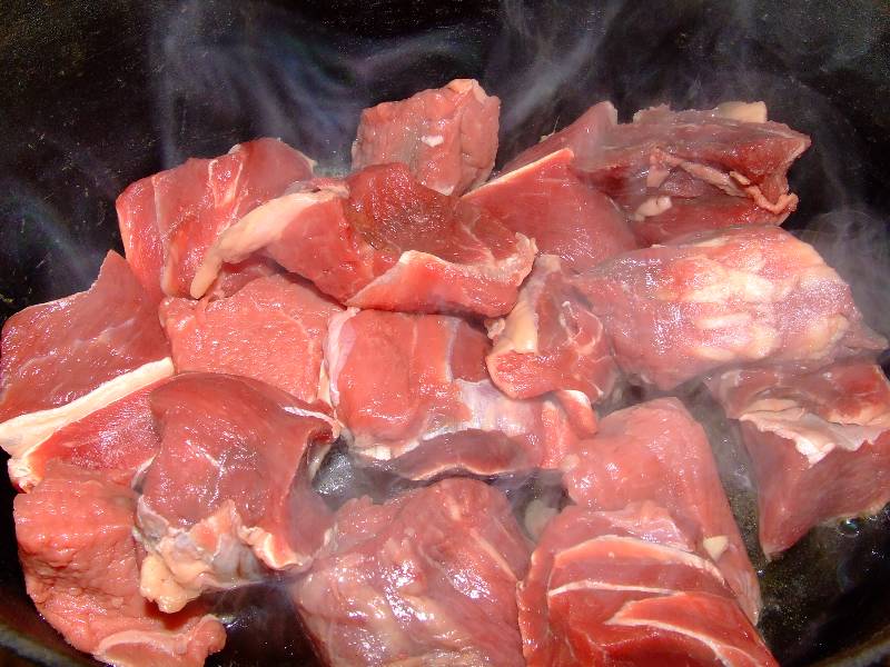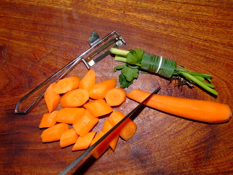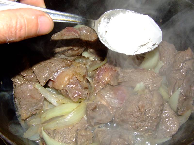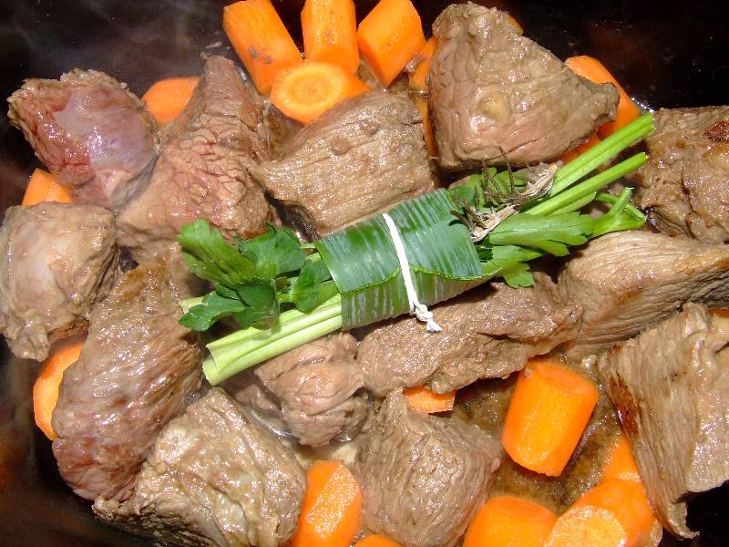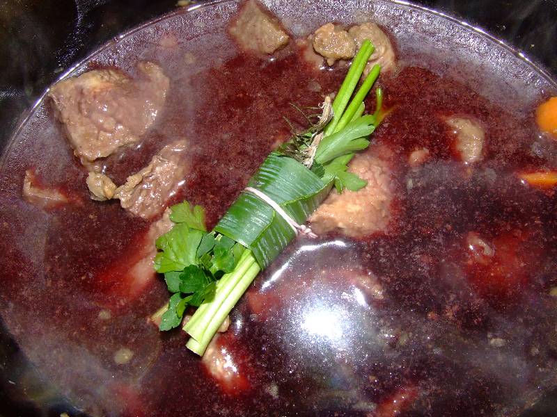 1-faire tremper les champignons dans un grand bol d'eau chaude une heure avant de commencer la recette 2-verser le vin dans une casserole sur feu vif et faire flamber pour évaporer l'alcool 3-dans une cocotte en fonte ou un faitout, faire dorer dans l'huile sur feu assez vif les morceaux de boeuf coupés en cubes 4-quand les morceaux sont dorés sur toute leurs faces, les retirer et les réserver, mettre à la place l'oignon émincé à dorer à feu doux Vin conseillé: Côte du Rhône rouge |