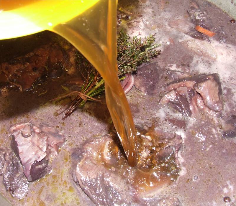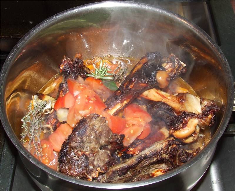 et faire suer au four 10 minutes 3-retirer à l'aide d'une écumoire le contenu de la plaque à rôtir et mettre dans une casserole, mouiller avec 2 litres d'eau froide et le vin blanc, ajouter le thym, le romarin, une gousse d'ail piquée d'un clou de girofle, une feuille de laurier, les grains de poivre et de coriandre, les tomates coupées grossièrement, porter à ébullition, puis baisser le feu et faire cuire 4 heures à ébullition lente et régulière en écumant fréquemment, en fin de cuisson passer au chinois dans un récipient sans fouler, puis refroidir très rapidement en plongeant le récipient dans un saladier rempli de glaçons, puis mettre au frais jusqu'au lendemain 4-le lendemain, sortir le plat contenant la gigue de chevreuil, prélever la viande et les légumes de la marinade bien les égouter, mettre dans une marmite avec un peu d'huile d'olive et faire suer une quinzaine de minutes |