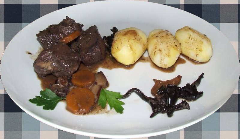 5-pendant ce temps faire tremper les trompettes des morts dans un bol d'eau tiède, sortir le fond de gibier, puis retirer la couche de gras qui c'est formée à la surface 6-saupoudrer la viande de farine, bien mélanger, saler légèrement, mouiller avec la marinade, verser le fond de gibier, les trompettes des morts et leur eau de trempage filtrée, porter à ébullition, puis réduire le feu et faire cuire à petite ébullition pendant 1 heure 30 7-en fin de cuisson, ajouter la poitrine fumée coupée en lardons, les girolles soigneusement nettoyées et coupées en deux ou quatre selon la grosseur et prolonger la cuisson encore une trentaine de minutes, laisser refroidir, puis mettre au frais jusqu'au lendemain 8-le jour même, sortir la daube et retirer la couche de graisse en surface, faire réchauffer et laisser réduire la sauce si necéssaire, rectifier l'assaisonnement au besoin 9-pendant ce temps éplucher les pommes de terre et les faires cuires une vingtaines de minutes dans une grande casserole d'eau bouillant salée, ou à la vapeur selon vos préférences 10-au moment de passer à table, mettre dans chaque assiette la daube accompagnée de pommes de terre, de girolles et trompettes des morts, nappper de sauce et servir aussitôt vous pouvez également accompagner de pâtes vin conseillé: Côte du Rhône rouge |