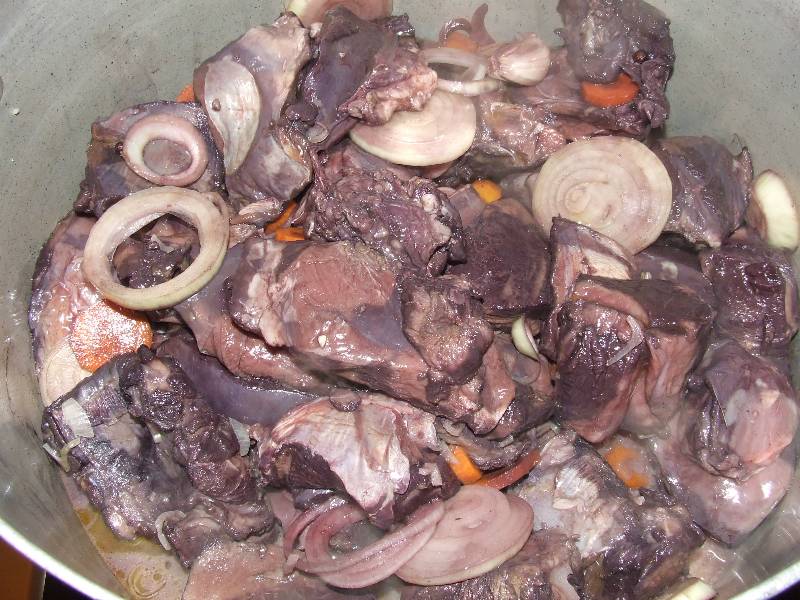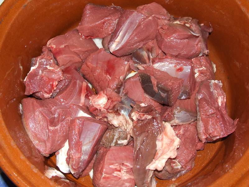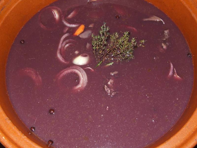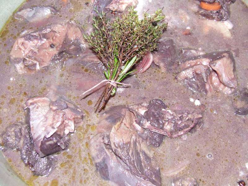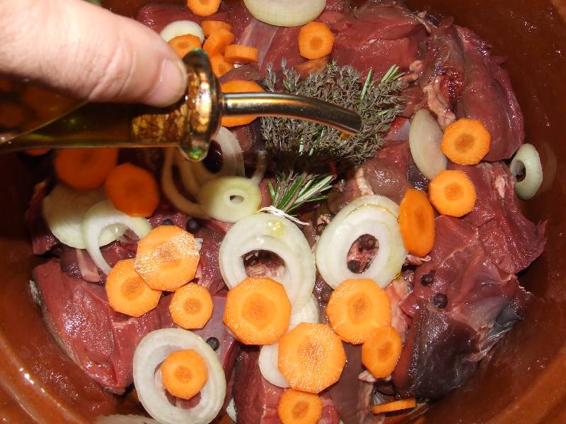 1-pour 10 personnes, deux jour avant, découper la gigue de chevreuil en cubes, mettre à mariner dans un grand plat creux avec deux carottes et les oignons coupé en rondelles, le bouquet garni, deux gousses d'ail écrasées avec la paume de la main, les grains de genièvre, arroser d'un filet d'huile d'olive, mouiller avec le vin rouge et mettre au frais pour 24 heures 2-préparer un fond de gibier avec les