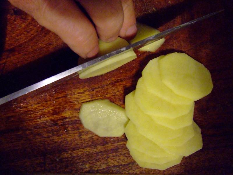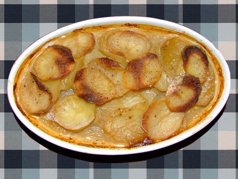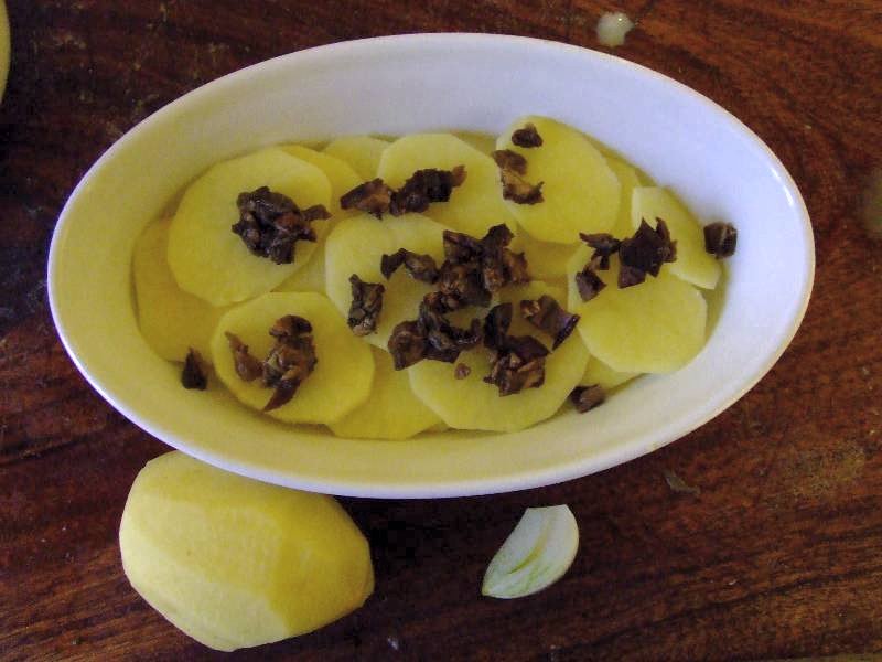 5-préchauffer le four à 220 °C ( th 7 ), éplucher, laver, puis couper les pommes de terre en fines rondelles 6-badigeonner un plat à gratin (ou 4 petits plats individuels) avec le beurre et y répartir les rondelles de pommes de terre en couches successives, en alternant avec les cèpes hachés, verser la sauce sur l'ensemble 7-Cuire l'estouffée au four pendant 45 minutes environ. Servir dès la sortie du four en accompagnement de viande grillée ou volaille rotie . vin conseillé: Gaillac rouge |