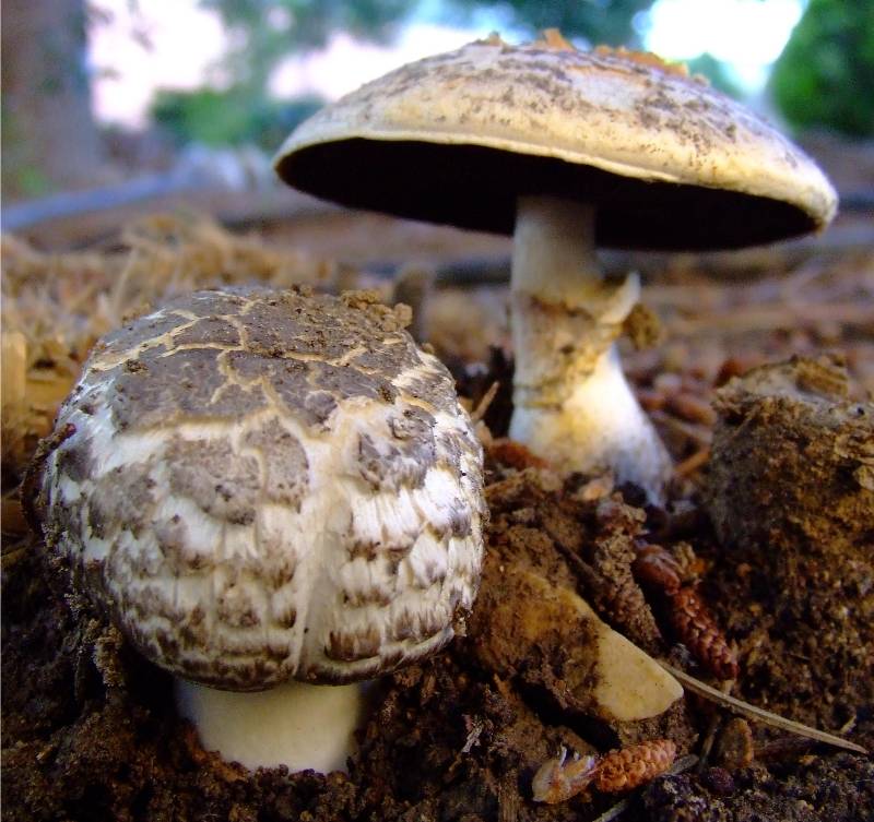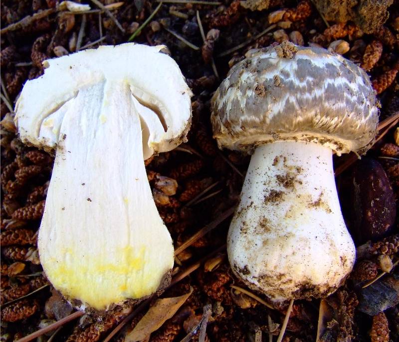 peu probable si l'on prend en considération les principaux signes distinctifs à savoir les écailles sur le chapeau, le jaunissement intense de la chair dans la base du pied, et l'odeur caractéristique de phénol. . |