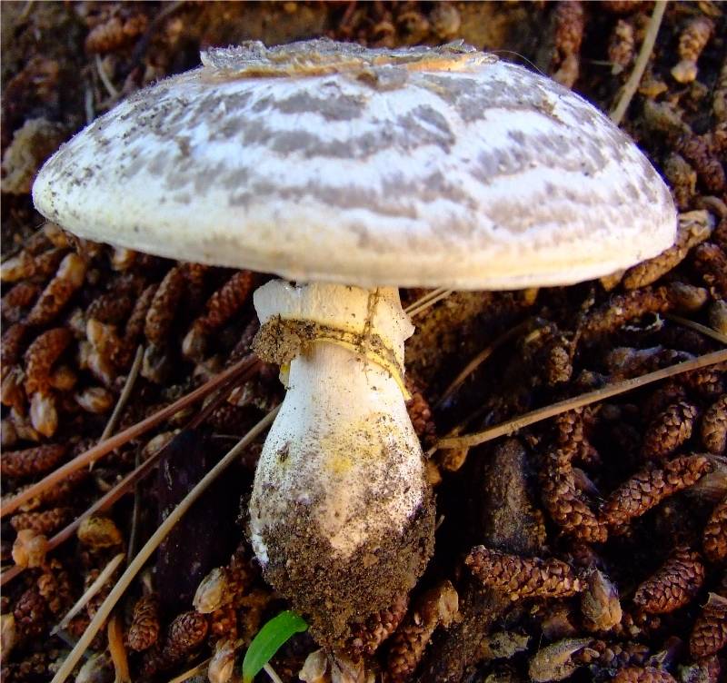 6 à 10 cm de hauteur, 1 à 1,5 cm de diamètre, base bulbeuse jusqu'à 2,5 cm de large, blanchâtre se tachant de jaune au toucher puis de brunâtre, creux, cassant se terminant en bulbe à la base, orné d'un anneau fragile se teintant de jaune. |