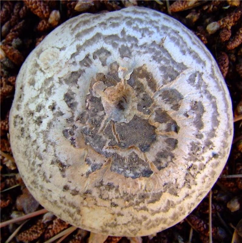 5 à 14 cm de diamètre, couvert d'écailles gris-brun sur fond gris-clair, très denses au centre, plus espacées sur la périphérie, imitant la couleur panachée du plumage d'une pintade |