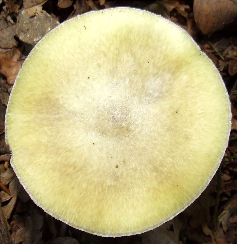 5 à 15 cm de diamètre, parfois blanc pur, mais le plus souvent brun verdâtre ou jaune-vert, à fibrilles radiales, marge non striée. |