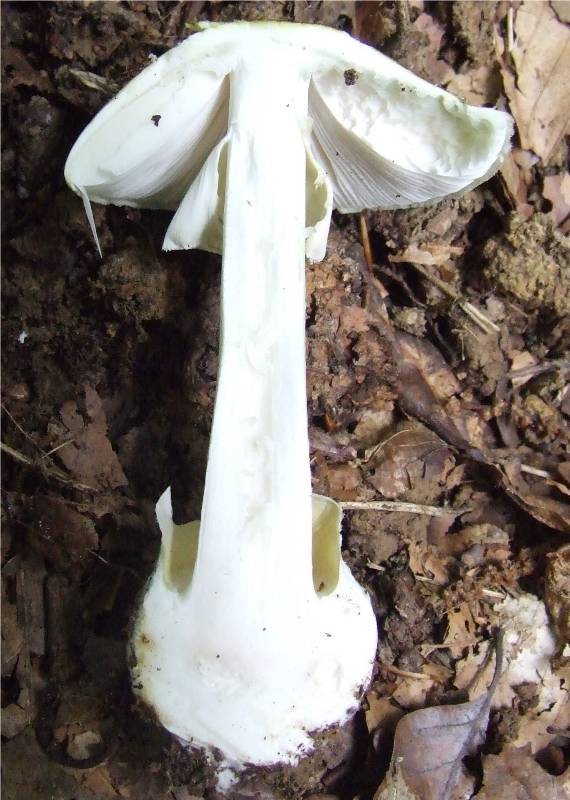 blanchâtre, parfois marbré de verdâtre, anneau large, strié, persistant, blanc; volve très volumineuse, blanche également. |