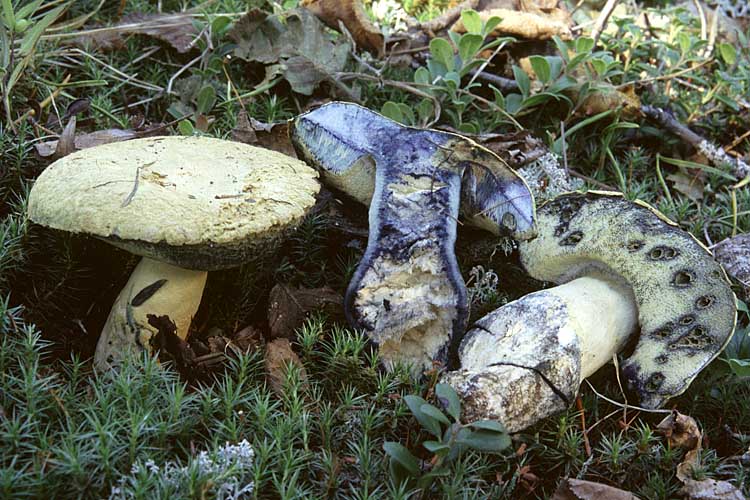 6 à 12 cm de diamètre, blanchâtre ou jaune citron pâle, bleuissant fortement au toucher, revêtu d'un feutrage, surtout sur la marge. |