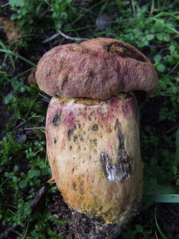 3 à 8 cm de haut, 1 à 5 cm de diamètre, épais et court, jaune pâle, avec un fin réseau jaune dans le tiers supérieur et rose vers la base |