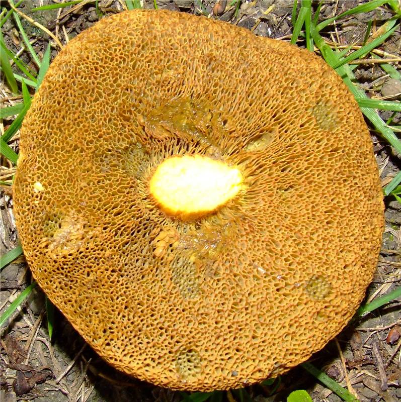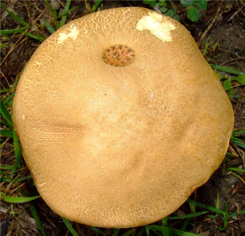 5 à 12 cm, arrondi, puis plan, se retroussant en coupe par temps sec, très velouté, chamoisé, brun olivâtre, un peu craquelé par temps sec, laissant apparaître la chair sous la cuticule. |