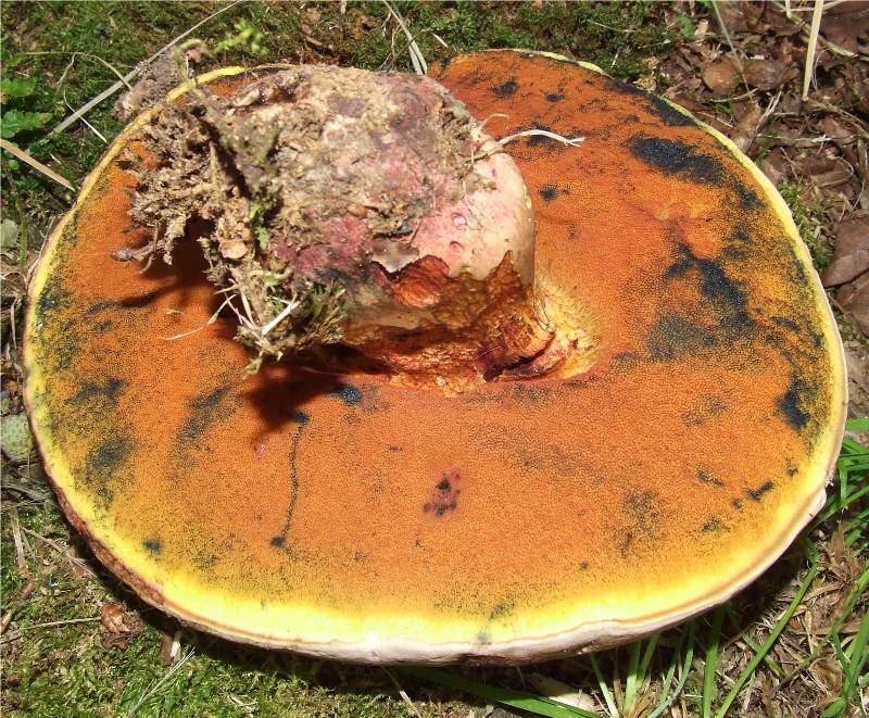 tubes séparables, jaunes, bleuissant, pores très étroits, inégaux, d'abord jaunes, devenant orangé, restant très tardivement jaune vers la marge, bleuissants au toucher |