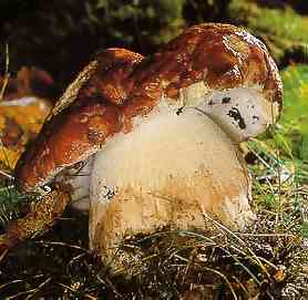 très renflé et plus court que le diamètre du chapeau, dur, blanc vers le haut, mais teinté d'ocre ou d'acajou vers le bas, orné d'un fin réseau blanc dans le haut. |