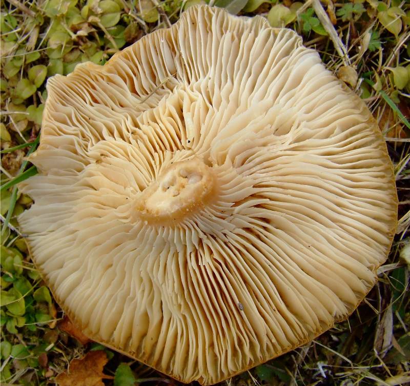 peu serrées, souples, fortement décurrentes, de couleur beige ou crème |