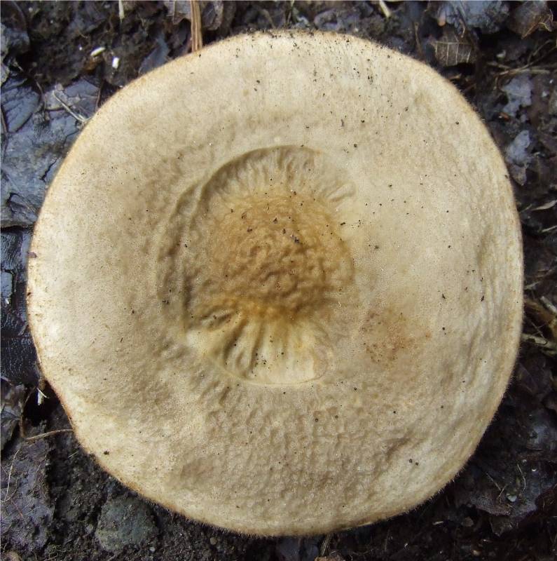 de 4 à 10 cm de diamètre, conique, puis plan omboné, fin, brun-jaune plus ou moins foncé, fortement visqueux et brillant par temps humide, devenant ridé. |