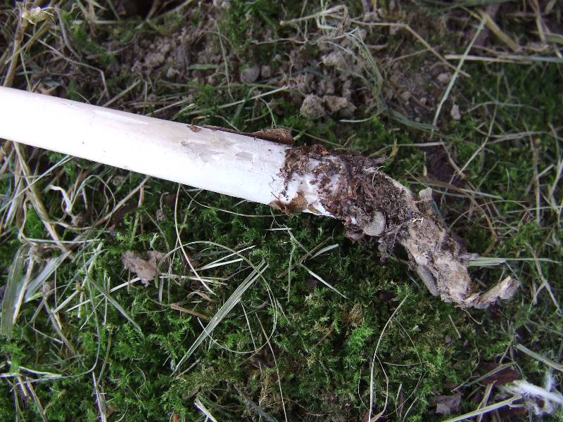 très long et svelte, profondément enterré, et pouvant atteindre 30 cm, raide, blanc grisâtre ou brunâtre, creux, coriace, à base bulbeuse, terminé en longue partie radiculaire cassante s'enfonçant dans le bois pourri. |