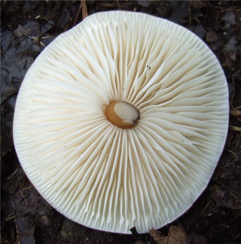 blanches ou crème, larges et espacées, adhérentes au pied. |