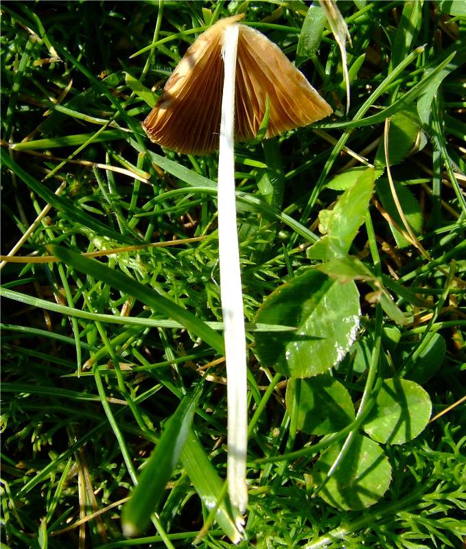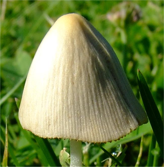 de 1 à 2,5 cm de hauteur, 1 à 1,5 cm de diamètre, allongé, couleur ivoire, cuticule lisse se ridant un peu avec l'âge, fines stries vers la marge apparentes par temps humide, légèrement visqueux par temps de pluie. |