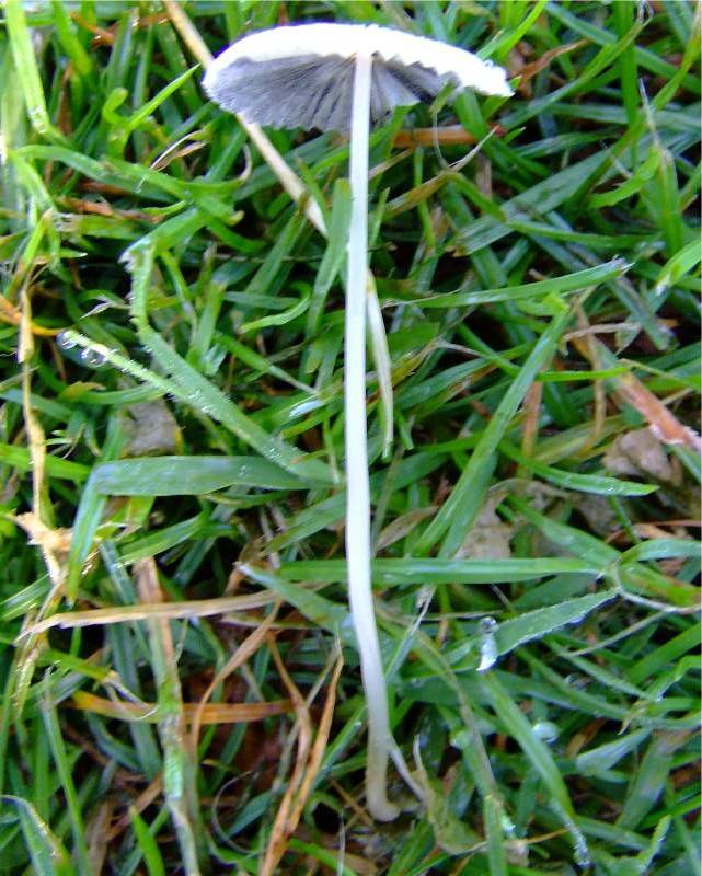 0,5 à 1,5 cm de diamètre ( parfois jusqu'à 2 cm ), 0,5 à 1,5 cm de hauteur, de forme ovoïde au début, puis conique et campanule, étalé avec l'âge, surface striée dès le début presque jusqu'au milieu, sans voile, d'abord ocre, puis progressivement grise à partir de la marge, centre le plus souvent un peu brun roux; à marge sinueuse et incisée, devenant rapidement déliquéscent. |